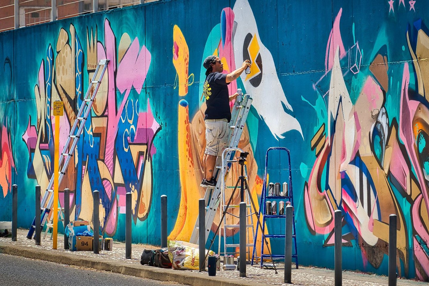 Com uma abordagem multidisciplinar que cruza graffiti, street art, ilustração e escultura site-specific.